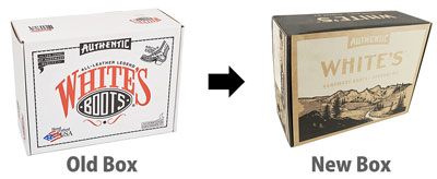 ホワイツの靴箱: ページに掲載の参考画像には旧白箱のものもありますが白箱は2022年で終了、現在使われていません。新デザインはホワイツ社の在る米国ワシントン州のウィルダネスをプリントしたものです。